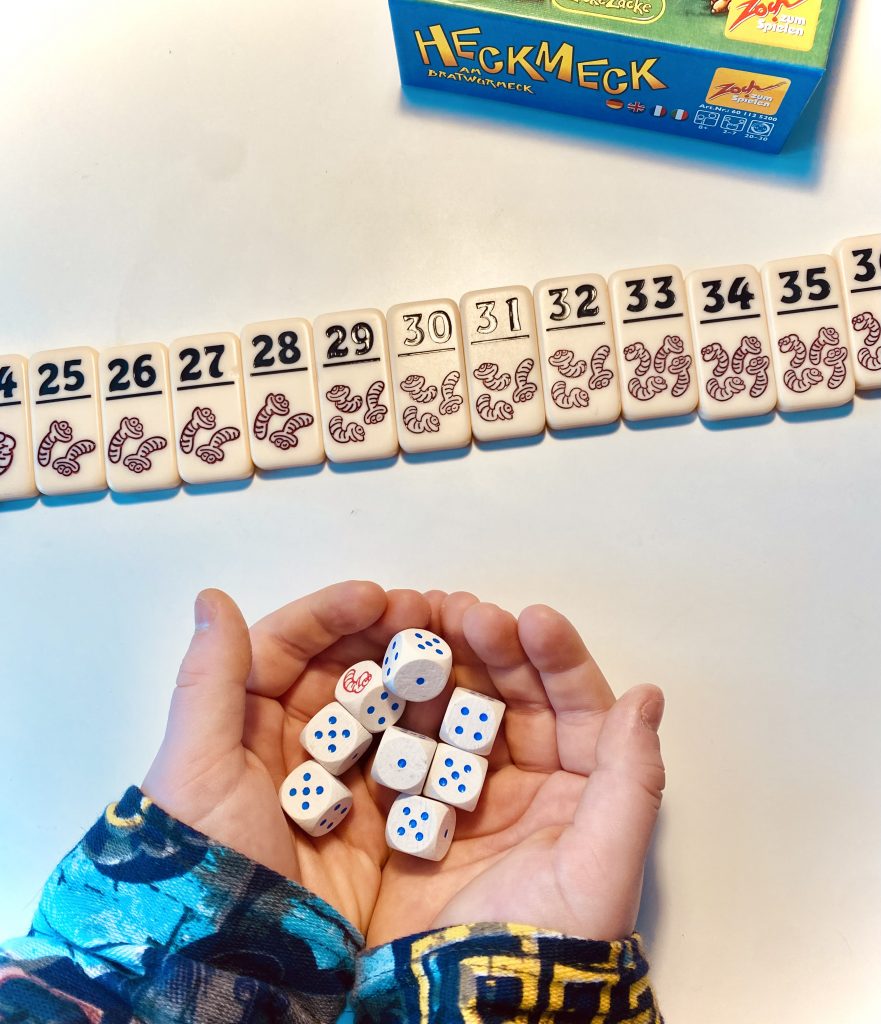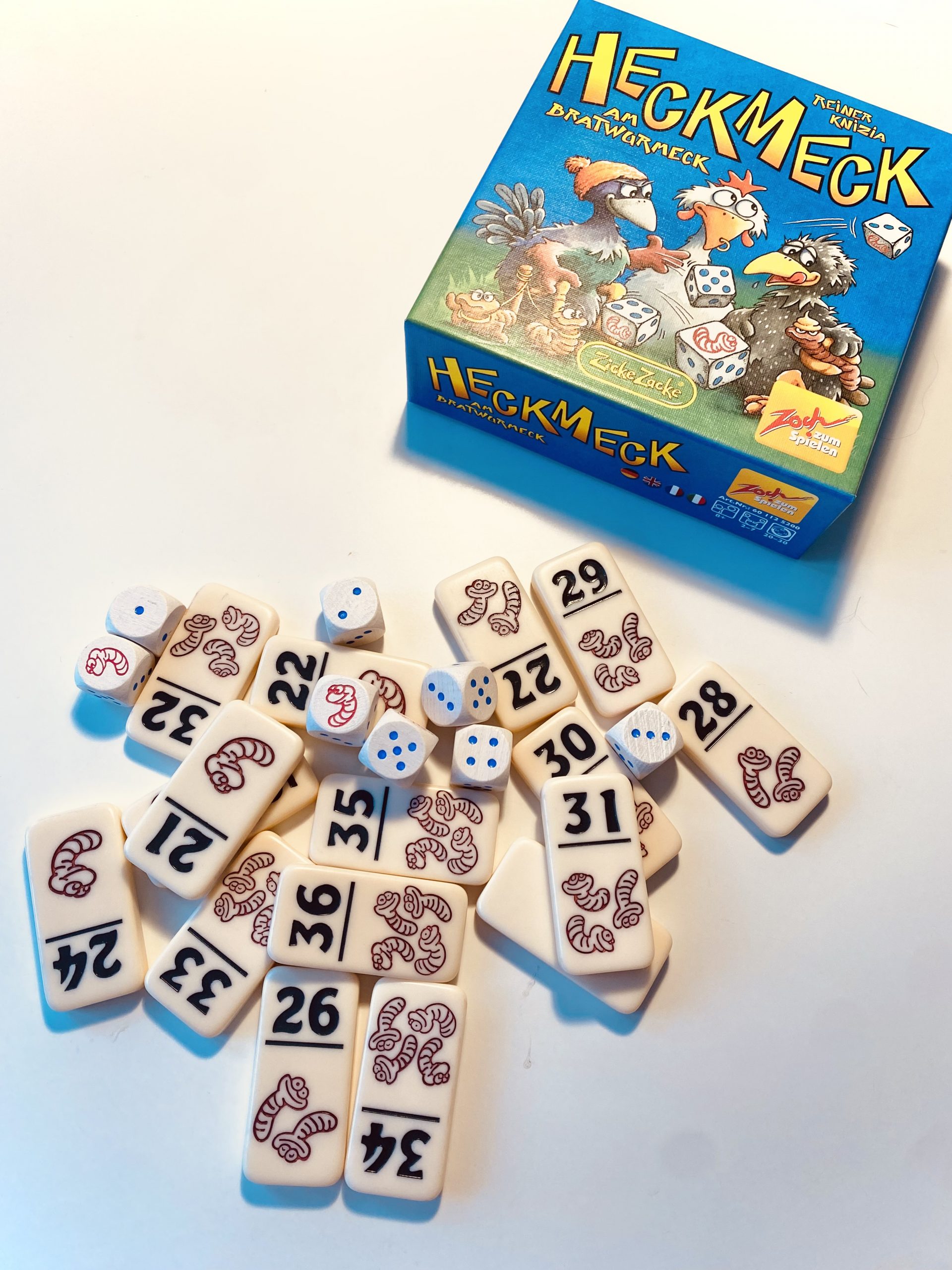 HECKMECK am Bratwurmeck macht mega Spass! 8 Würfel werden gewürfelt und müssen so kombiniert werden, dass eine möglichst hohe Summe erreicht wird. Anhand der Summe werden Würmer erspielt, wer am Ende die meisten Würmer im Schnabel hat, hat das Spiel gewonnen. Die Augen auf den Würfeln müssen zusammengezählt werden…soll ich noch mal würfeln oder lieber auf Nummer sicher gehen? Ein Spiel für große und kleine Zocker!